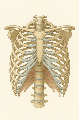 まず骨の構造ですが、胸郭は左右に12本ずつの肋骨があり、それが前で胸骨(胸の真ん中の骨)、後ろで胸椎(背骨の胸の部分)につながっています。これらが弓なりになりながら一つの“かご”を作り、外からの衝撃を受け止める役割を果たします。