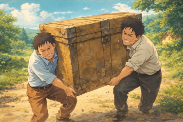 本来4人で運ぶ荷物を、2人だけで持っている状態。